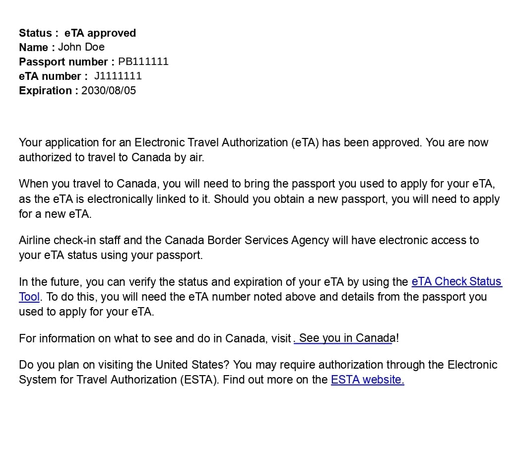 Example of a Canada eTA Confirmation Email (For Reference Only)